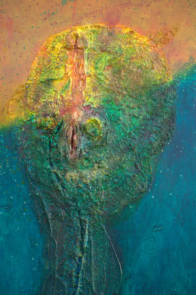 Ególatra. 2024. Acrílico y objetos sobre tabla de 130x97 cm.