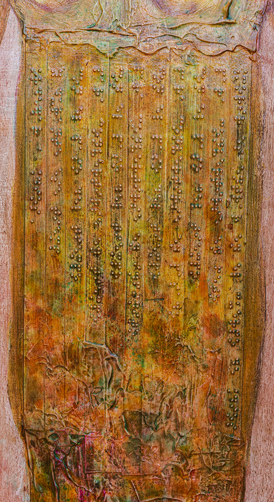 Acrílico sobre caja de madera de 116 x 32 cm. Presenta un poema escrito en braille, para leerlo en completa oscuridad.